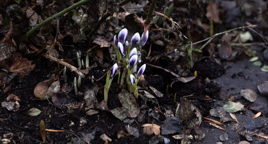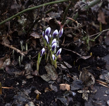 We had record amounts of snow this year, which made it impossible to get into the garden and take down the Christmas decorations. The snow has finally melted, but now the ground is too wet to walk on. This may be the first time I’ve had crocuses blooming alongside Christmas decor! Just looking at the photo has me cringing a bit... oh dear...